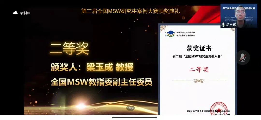 2022年5月15日,第二届“全国MSW研究生案例大赛”决赛暨颁奖典礼在云端举行。决赛采用线上评审和答辩的方式,全程采取参赛选手与评委“双向匿名”的模式。36支参赛队伍按照随机分层分组的方式,分为三个小组,15位全国社会工作专业学位研究生教育指导委员会委员受邀担任评委,按照“指导教师回避”和“单位回避”的原则,对参赛队伍提交的案例进行了评选。