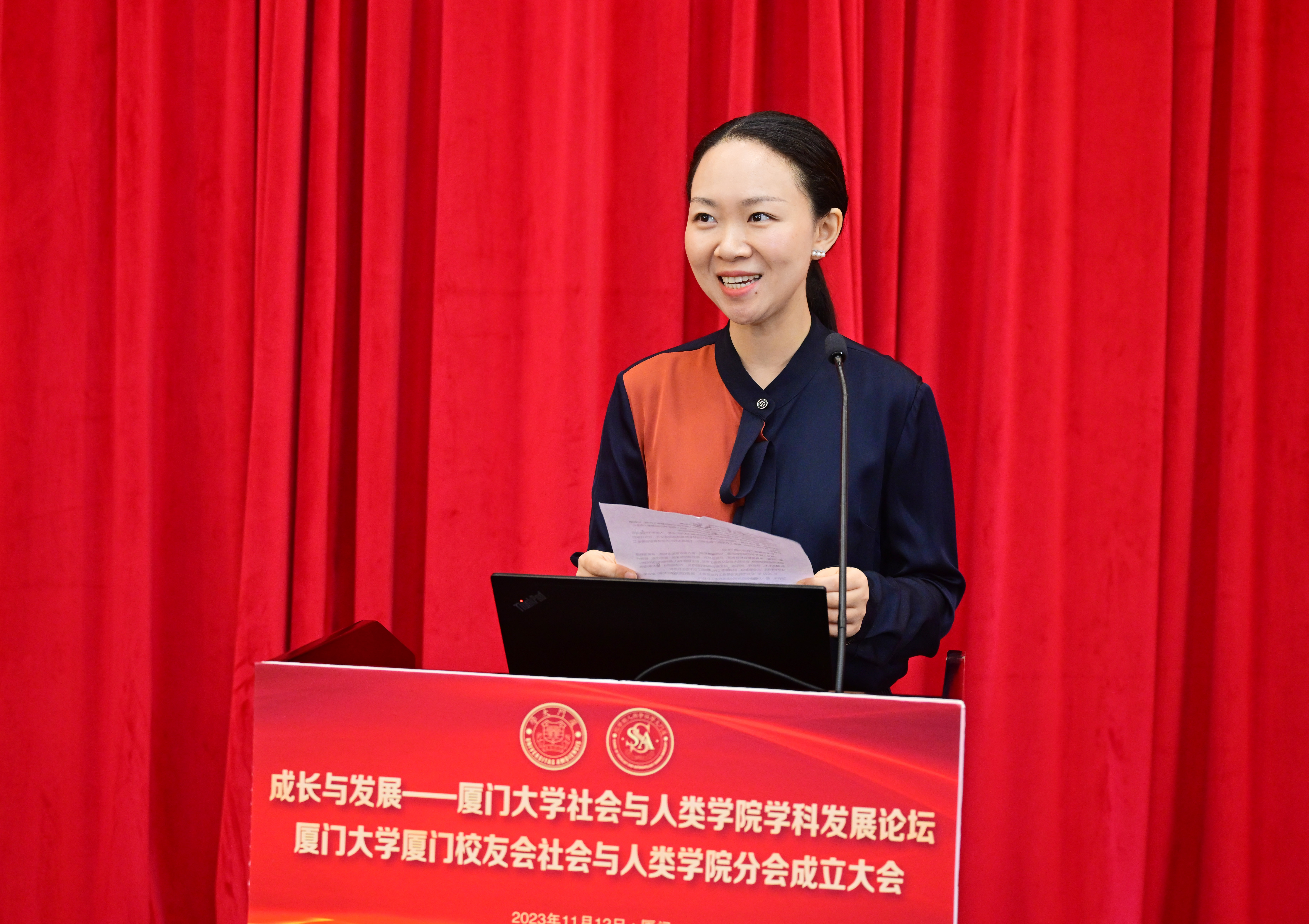成立大会上,2002级社会工作专业校友张晓蕾代表筹备组汇报新太阳集团5493con厦门校友会社会与人类学院分会的筹备情况。