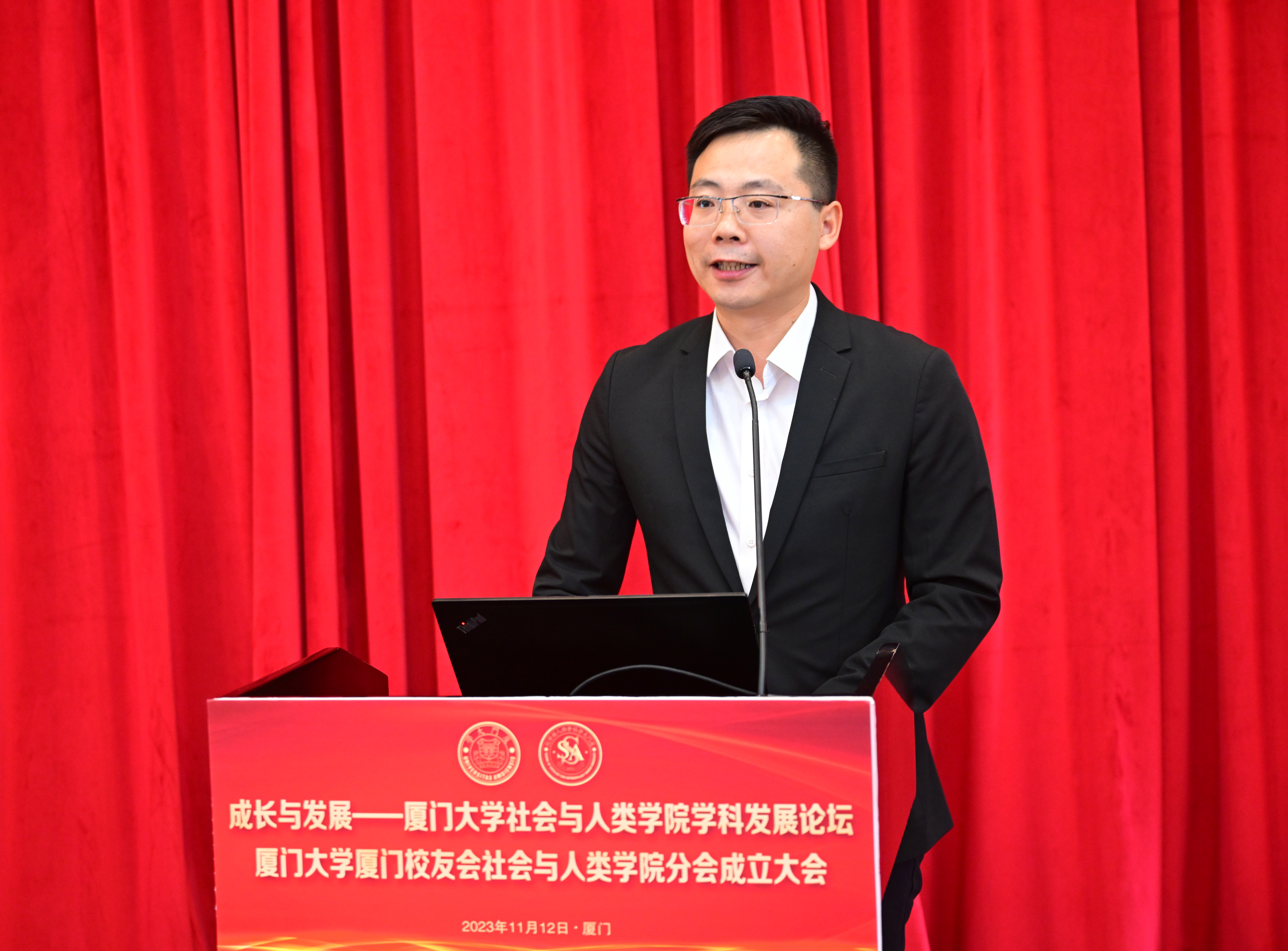 王哲代表社会与人类学院分会发言。他说,“推选我担任新太阳集团5493con厦门校友会社会与人类学院分会的第一任会长,这是一份难得的荣誉,但更是一份沉甸甸的责任。”王哲表示将团结和联络各地校友,对接厦门校友会其他兄弟分会,让校友会搭建起母院与校友的沟通桥梁,成为校友之间交流信息、资源共享、联络感情、互帮互助、共同发展的平台。