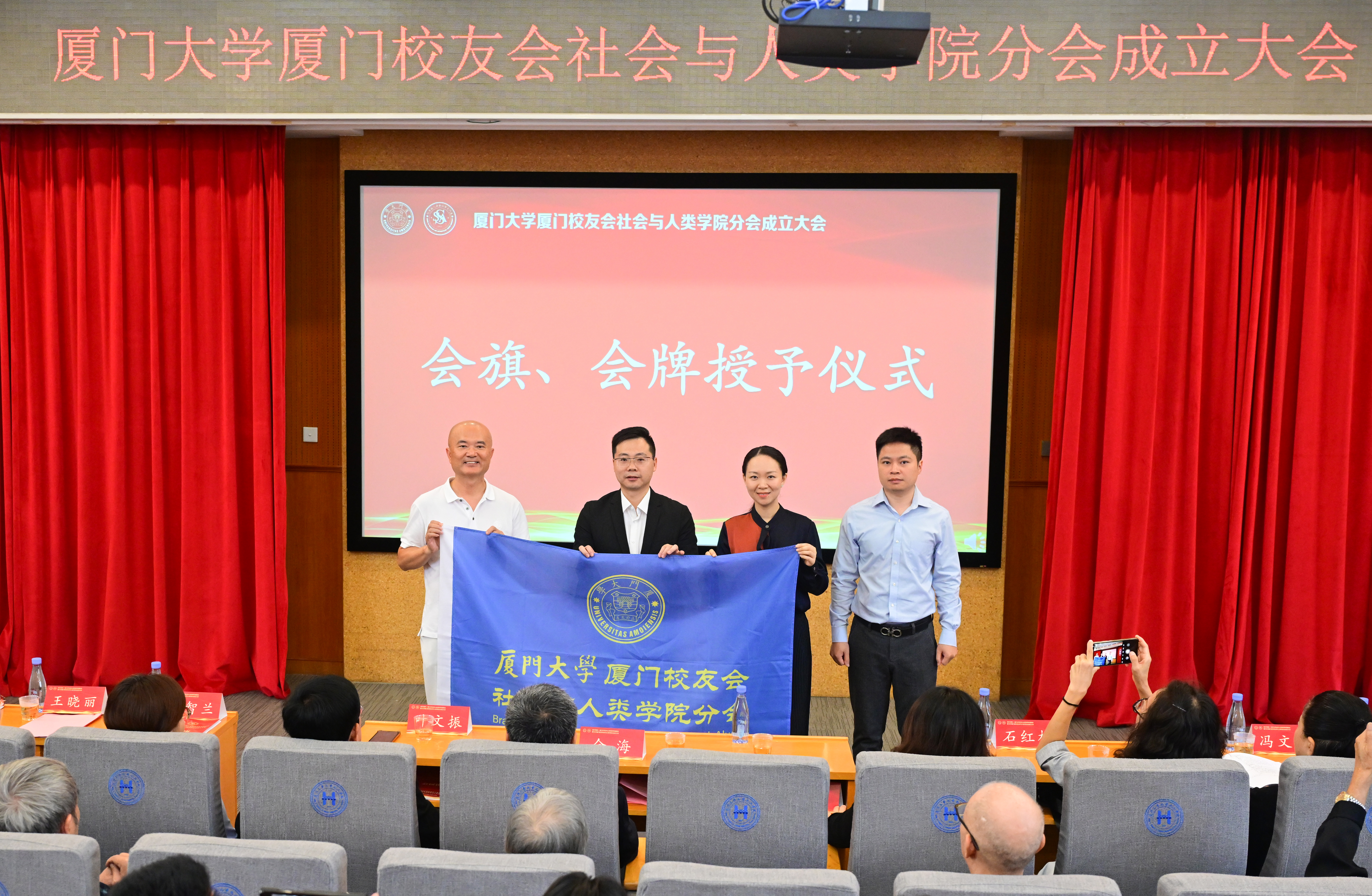 姚明向社会与人类学院分会会长王哲、副会长张晓蕾、吴小杭授予会旗和会牌。