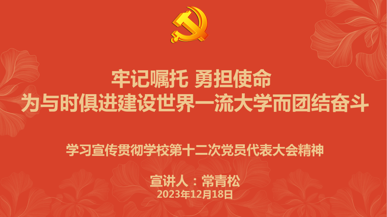 最后,学校第十二次党代会精神宣传团成员、学院党委委员常青松副教授作题为《牢记嘱托 勇担使命 为与时俱进建设世界一流大学而团结奋斗》的报告。常青松从校第十二次党代会的全貌概述及举措要点等方面展开,利用宏观微观相结合的方式传达阐述了学校第十二次党代会精神。他表示,迈入新时代新征程,高校教师应牢记嘱托、勇担使命,紧密围绕高质量发展的主题推进理论创新和实践创新,用好调查研究传家宝,从调研中发现问题,解决问题,把论文真正写在祖国大地上。