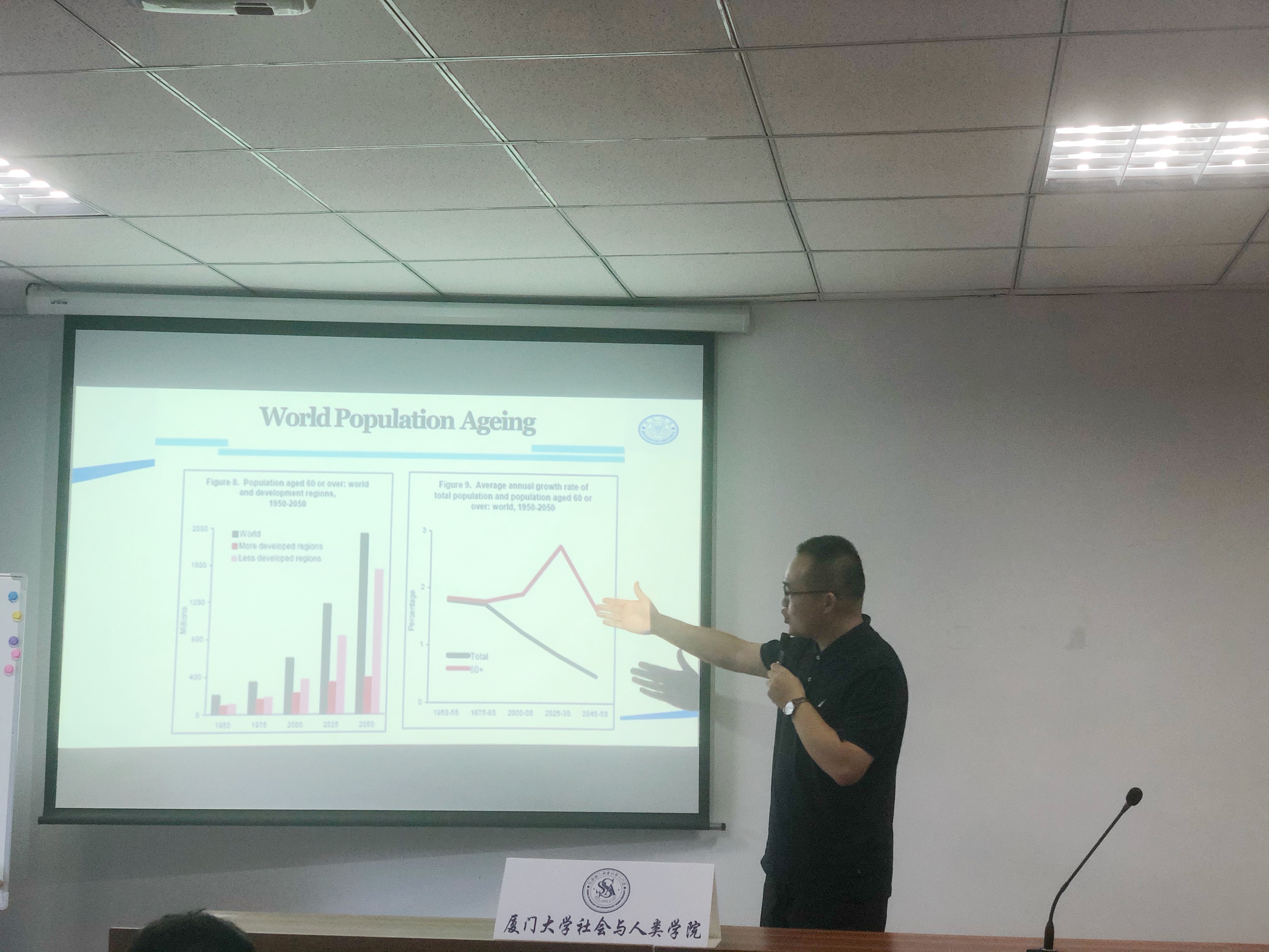 最后一名参赛者为社会学系常青松老师,主讲“人口老龄化”问题。常老师首先明确提出该堂课程的学习目标,通过丰富的数据图表进行分析,教学过程精神饱满,感染力强。