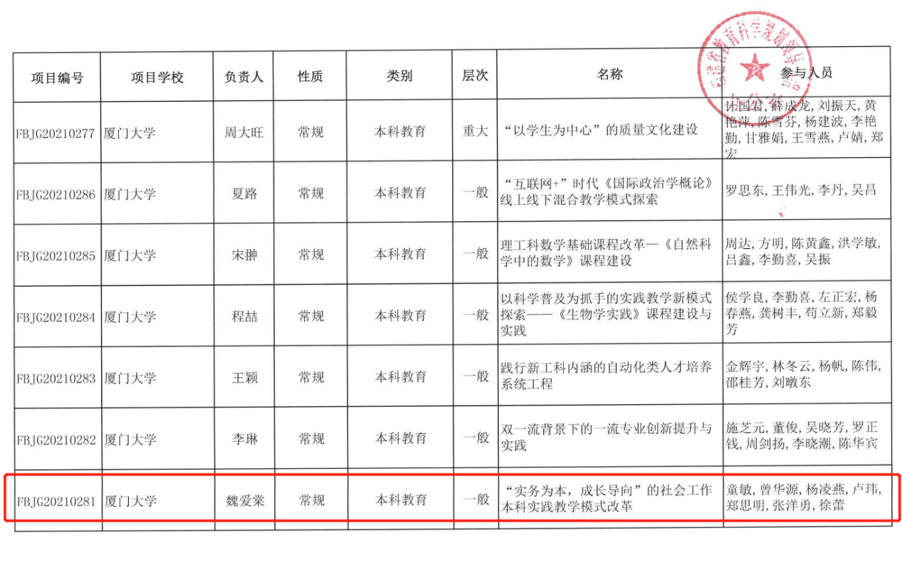 我院魏爱棠教授牵头项目入选2021年度福建省本科高校教育教学改革研究项目 2021年11月29日 点击:[] 11月22日,福建省教育科学规划领导小组办公室公布了2021年本科高校教育教学改革研究项目立项名单。我院社会工作系魏爱棠教授牵头的《“实务为本,成长导向”的社会工作本科实务实践教学模式改革》项目获得本科教育一般项目立项。 教育教学改革研究项目是进一步深化高等教育教学改革,全面提高教育教学质量的重要举措,旨在培育优秀教学成果,提升内涵建设水平,提高人才培养质量。 学院将加强项目建设的过程管理,在组织、制度、经费等方面为项目建设提供保障,及时总结和推广项目成果,做好检查与结题工作,确保项目按期保质保量完成建设任务。