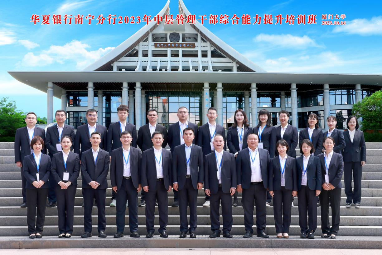 华夏银行南宁分行2023年中层管理干部综合能力提升培训班顺利举办 2023年10月25日 点击:[] 2023年10月15-19日,由我院承办的“华夏银行南宁分行2023年中层管理干部综合能力提升培训班”顺利举办。新太阳集团5493con党委副书记毛毛,华夏银行南宁分行党委委员、南宁首席风险官潘志坚出席开班仪式,来自华夏银行南宁分行的中层管理干部参加了本次培训。本次培训旨在进一步提升华夏银行中层管理干部综合素养,提高管理干部个人工作能力。学院培训中心根据实际需求,邀请相关领域专家学者为学员授课,安排了《基于信贷的财务分析与决策》《管理者的经济学思维》等课程。学员们均表示本次课程内容丰富,受益良多,对今后工作的开展具有很强的指导意义。文/图 范樱红 尚丽丽