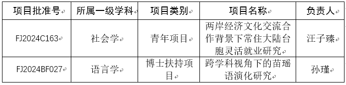 喜报│我院2项课题获福建省社科立项 2024年03月27日 点击:[] 2024年3月25日,2024年度福建省社会科学基金项目立项结果公布,我院助理教授汪子臻的“两岸经济文化交流合作背景下常住大陆台胞灵活就业研究”获青年项目立项,博士后孙瑾的“跨学科视角下的苗瑶语演化研究”获博士扶持项目立项。编辑:何静审定:毛毛