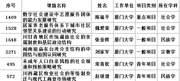 拟获资助立项的六个项目中,社会学系陈福平教授获重点项目资助,魏爱棠教授、张亚辉教授、刘家军副教授等3位教师获一般项目资助,常青松副教授和博士后赵珽健获得青年项目资助。此次我院共申请项目14项,获立项率为43%,远超全国平均申报立项率。