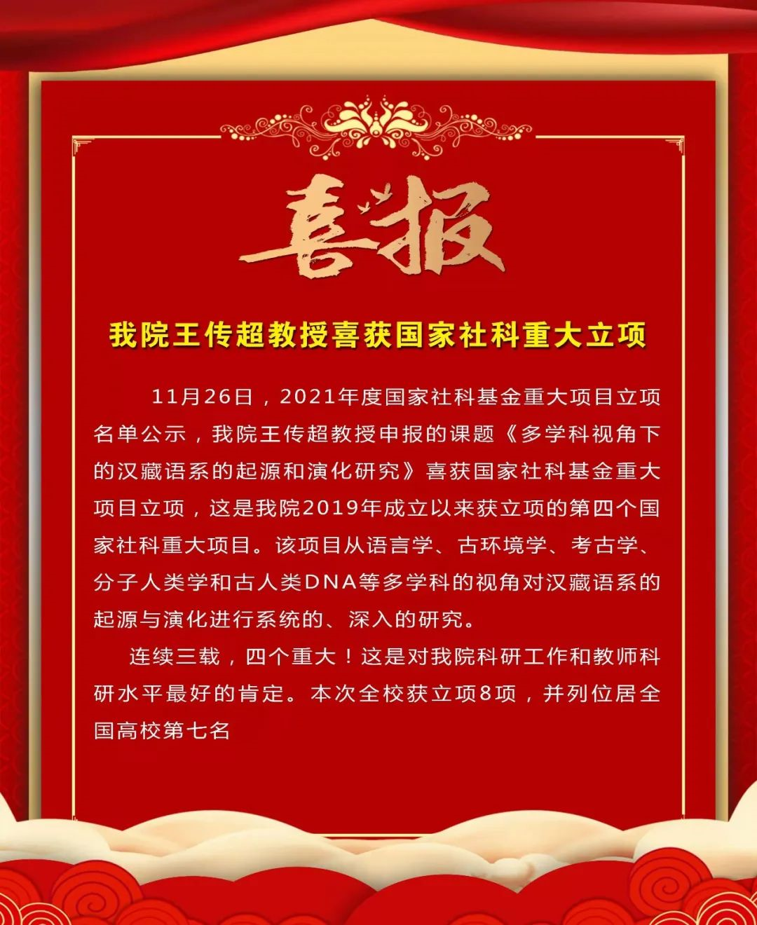 再传佳讯!11月26日,2021年度国家社科基金重大项目立项名单公示,我院王传超教授的课题《多学科视角下的汉藏语系的起源和演化研究》喜获国家社科基金重大项目立项,这是我院2018年成立以来的第四个重大立项。连续三载,四个重大!这是对我院科研工作和教师科研态度最好的肯定。本次全校获立项八项,并列位居全国高校第七名。