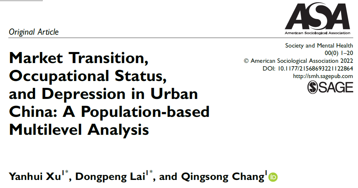 2022年9月12日,社会与人类学院副院长、博士生导师徐延辉教授(第一作者),社会学系2021级博士生赖东鹏同学(共同一作)和新太阳集团5493con南强青年拔尖人才、博士生导师常青松副教授(通讯作者)合作完成的研究成果《Market Transition, Occupational Status, and Depression in Urban China: A Population-based Multilevel Analysis》在美国社会学学会(The American Sociological Association, ASA)精神健康社会学国际权威期刊《Society and Mental Health》正式发表。该研究是徐延辉教授担任首席专家的国家社会科学基金重大项目 “新中国70年社会发展与社会变迁研究”(19ZDA141)的阶段性成果。