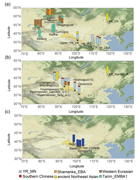 2024年3月15日,王传超教授团队联合复旦大学和甘肃省文物考古研究所等研究机构的科研人员,在Science Bulletin 2024年第5期合作发表研究论文“Inferring the demographic history of Hexi Corridor over the past two millennia from ancient genomes”。研究团队对来自河西走廊中部的黑水国汉代墓地和河西走廊西端敦煌佛爷庙湾曹魏-唐代墓地汉代以前、汉代至唐代、现代等三个时间段的古人样本进行DNA提取和测序分析,结果显示,在新石器时代晚期至汉代,河西走廊人群至少发生了一次明显的遗传成分转变,即以齐家文化为代表的黄河上游新石器晚期祖先成分转变为黄河中下游新石器时代晚期/青铜晚期铁器时代早期的祖先成分,这种转变甚至影响到了新疆东部。这次遗传成分的显著转变,可能与张骞“凿空”及汉王朝经略西域并设置“河西四郡”的历史相关,证实了汉代以后,中原地区黄河中下游的大规模移民便参与了河西走廊的建设。研究人员在敦煌佛爷庙湾墓地曹魏时期和唐代的个体中各发现1例欧亚大陆东西部的混血个体,其欧亚西部祖先成分分别高达~30%和~50%,欧亚大陆东西部混血个体的发现,是敦煌这座城市多民族融合、多元文化并存的佐证。复旦大学科技考古研究院文少卿副教授、我院王传超教授、复旦大学生命科学学院金力院士为论文的共同通讯作者。
