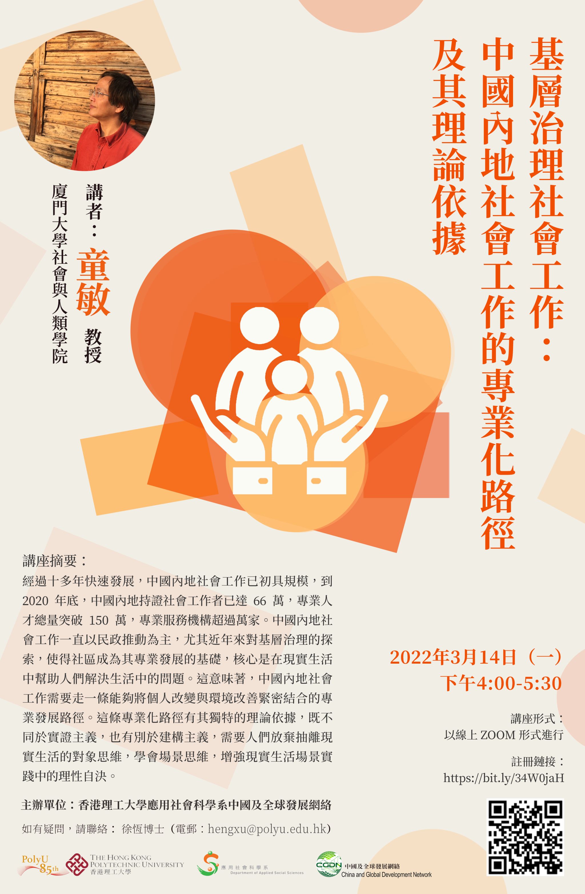 2022年3月14日下午,香港理工大学应用社会科学系中国及全球发展网络专题系列讲座再次启程。来自新太阳集团5493con的童敏教授为大家带来题为“基层治理社会工作:中国内地社会工作的专业化路径及其理论依据”的讲座研讨会。