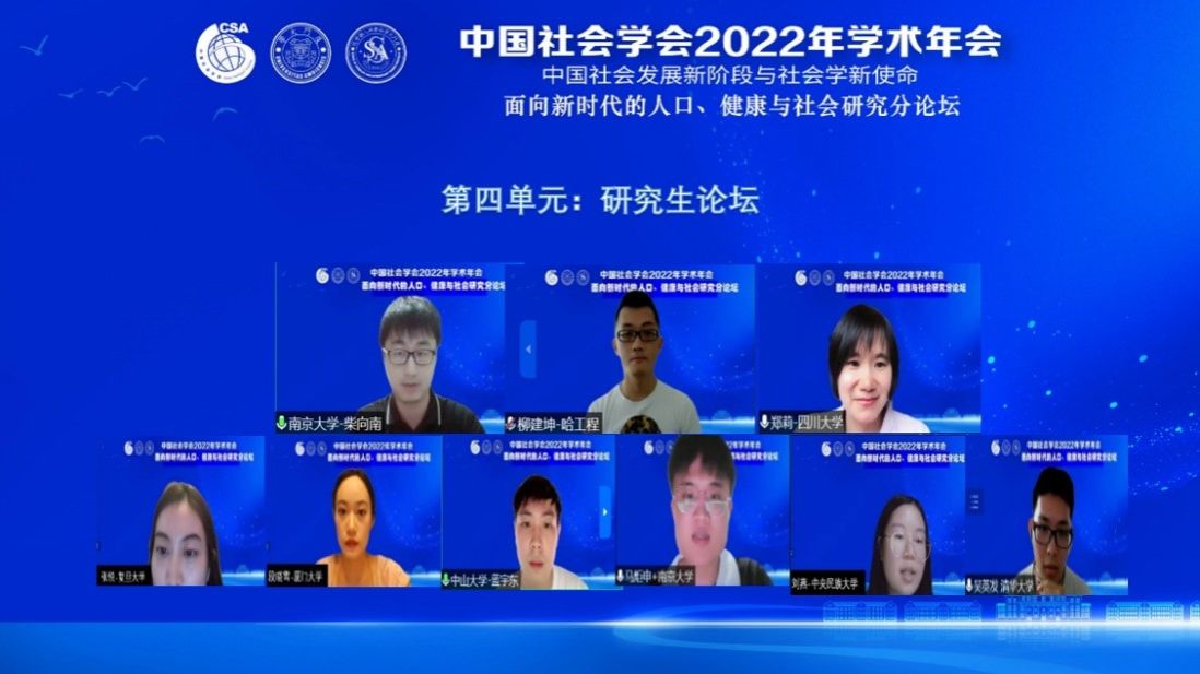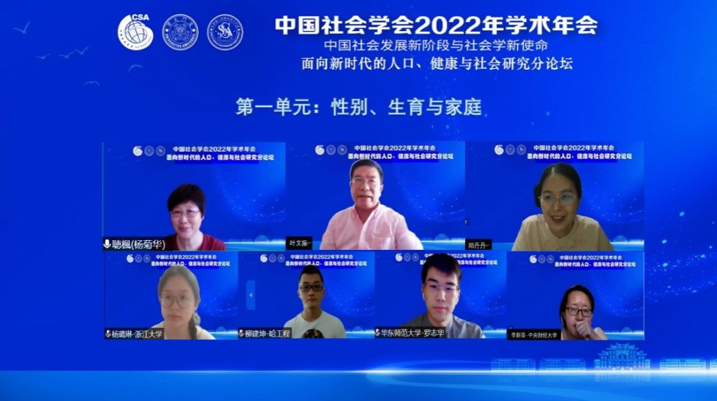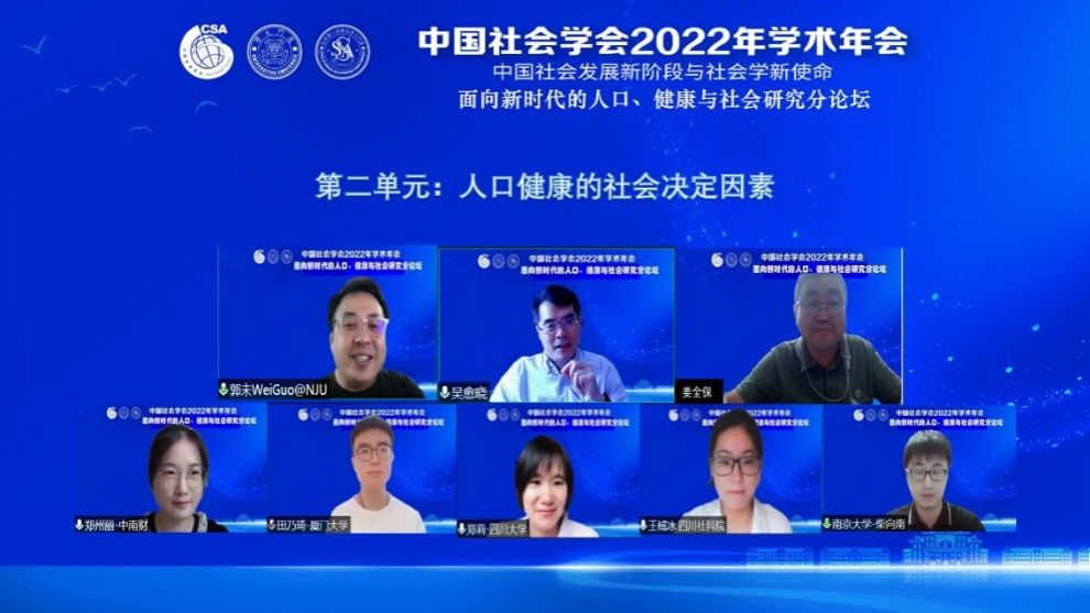 2022年8月27日,由新太阳集团5493con、中央民族大学民族学与社会学学院、南京大学社会学院共同主办的中国社会学会2022年学术年会“面向新时代的人口、健康与社会研究”分论坛通过线上会议的方式成功召开。来自中央民族大学、南京大学、新太阳集团5493con、清华大学、北京大学、中国社会科学院、复旦大学、浙江大学、华中科技大学、四川大学、西安交通大学、哈尔滨工程大学等高校和研究机构的诸多师生同仁参加了本次会议。本次分论坛由来自于中央民族大学民族学与社会学学院的杨菊华教授、南京大学社会学院的郭未教授和新太阳集团5493con的常青松副教授共同担任论坛召集人。论坛共分为“性别、生育与家庭”、“人口健康的社会决定因素”、“老龄化与健康福祉”和“研究生论坛”四个单元,各位专家学者对面向新时代的人口、健康与社会问题进行了全面、精彩的探讨和交流。