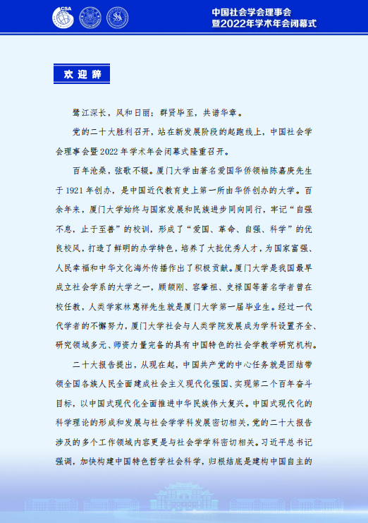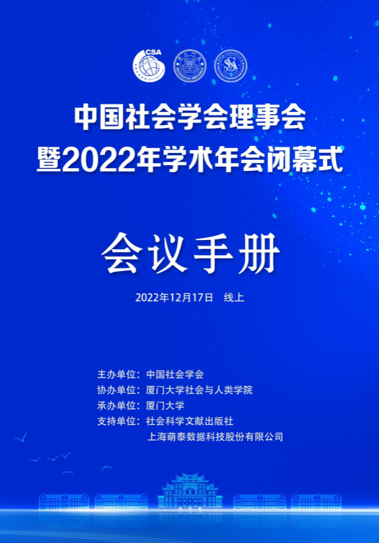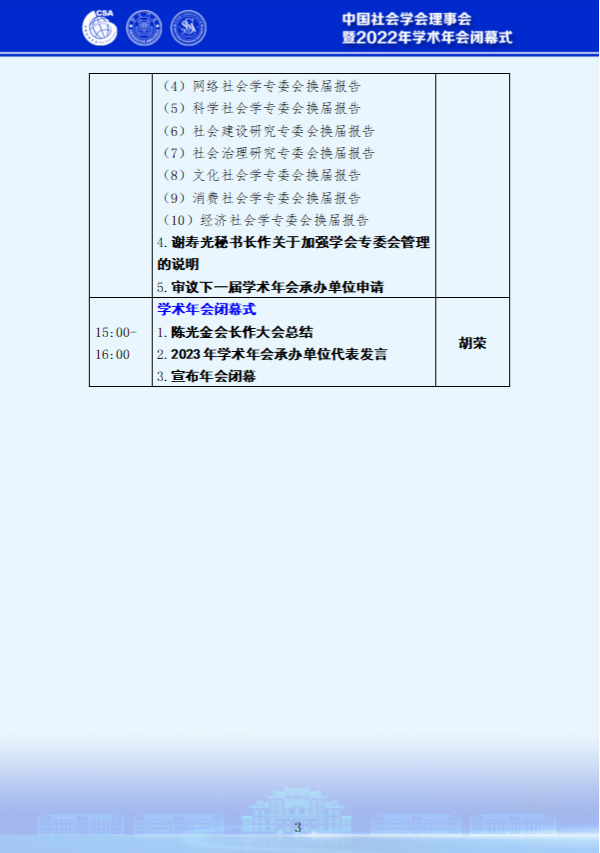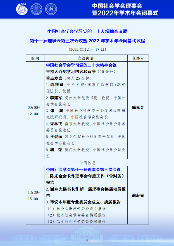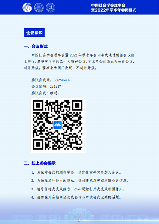 关于召开中国社会学会理事会暨2022年学术年会闭幕式的通知 2022年12月16日 点击:[] 受疫情不确定性影响,原定于2022年12月16日至18日在新太阳集团5493con举行的中国社会学会理事会暨2022年学术年会闭幕式,改为12月17日于线上云端举行,敬请谅解。会议日程安排如下:09:00-12:00 中国社会学会学习党的二十大精神会议13:30-15:00 中国社会学会第十一届理事会第三次会议15:00-16:00 中国社会学会2022年学术年会闭幕式此次会议通过腾讯会议线上举行,其中学习党的二十大精神会议、学术年会闭幕式为公开会议,对外开放。参会链接将在学会官网发布的会议手册内公布,敬请关注。理事会为闭门会议,不对外开放。中国社会学会2022年12月14日