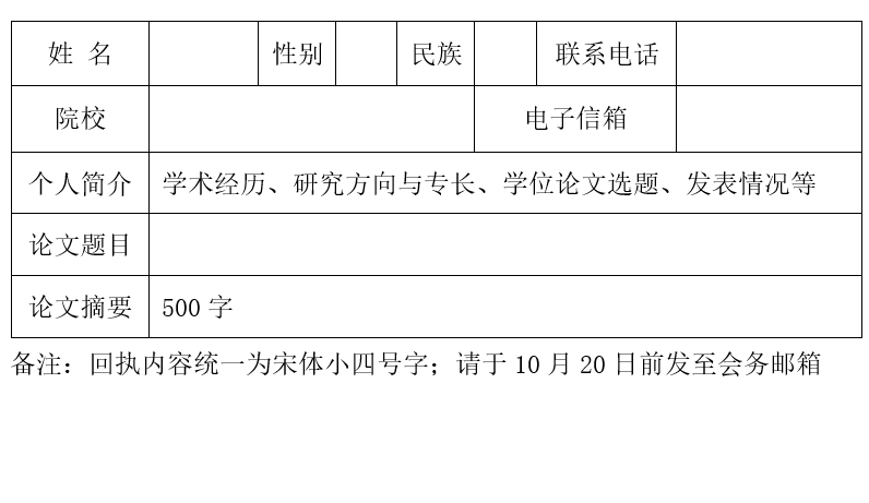 有意参与论坛的博士请于2023年10月20日前提交论坛回执到会务邮箱,邮件主题和附件请以 “院校名_姓名_论文题目” 方式命名。主办方经过遴选后第一时间发出正式邀请,受到正式邀请者请在11月1日前将论文电子版发送至会务邮箱。论文应严格遵守学术规范,理论研究和经验研究均可,以10000-20000字为宜,论文格式请参照《民族研究》。