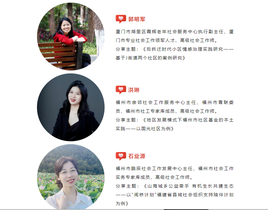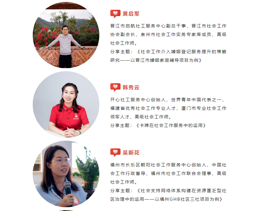 14:15-14:30 | 报告1:《社会支持网络体系构建在资源匮乏型社区治理中的运用——以福州GHB社区三社项目为例》 分享人:吴新花 福州市长乐区朝阳社会工作服务中心 |