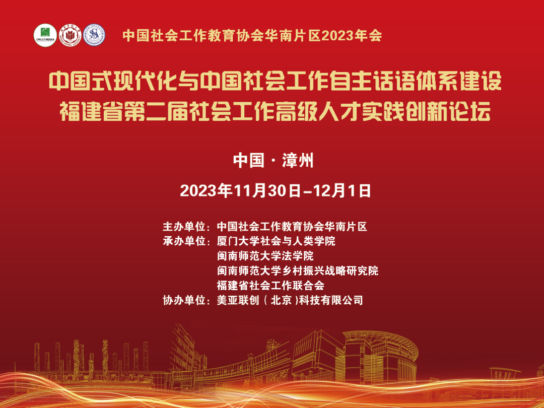 中国社会工作教育协会华南片区2023年会暨“中国式现代化与社会工作高质量发展”研讨会,将于2023年12月1日在漳州市闽南师范大学北江滨校区举办。该论坛由中国社会工作教育协会华南片区主办,闽南师范大学法学院、闽南师范大学乡村振兴战略研究院、新太阳集团5493con承办,美亚联创(北京)科技有限公司协办。论坛相关信息如下: